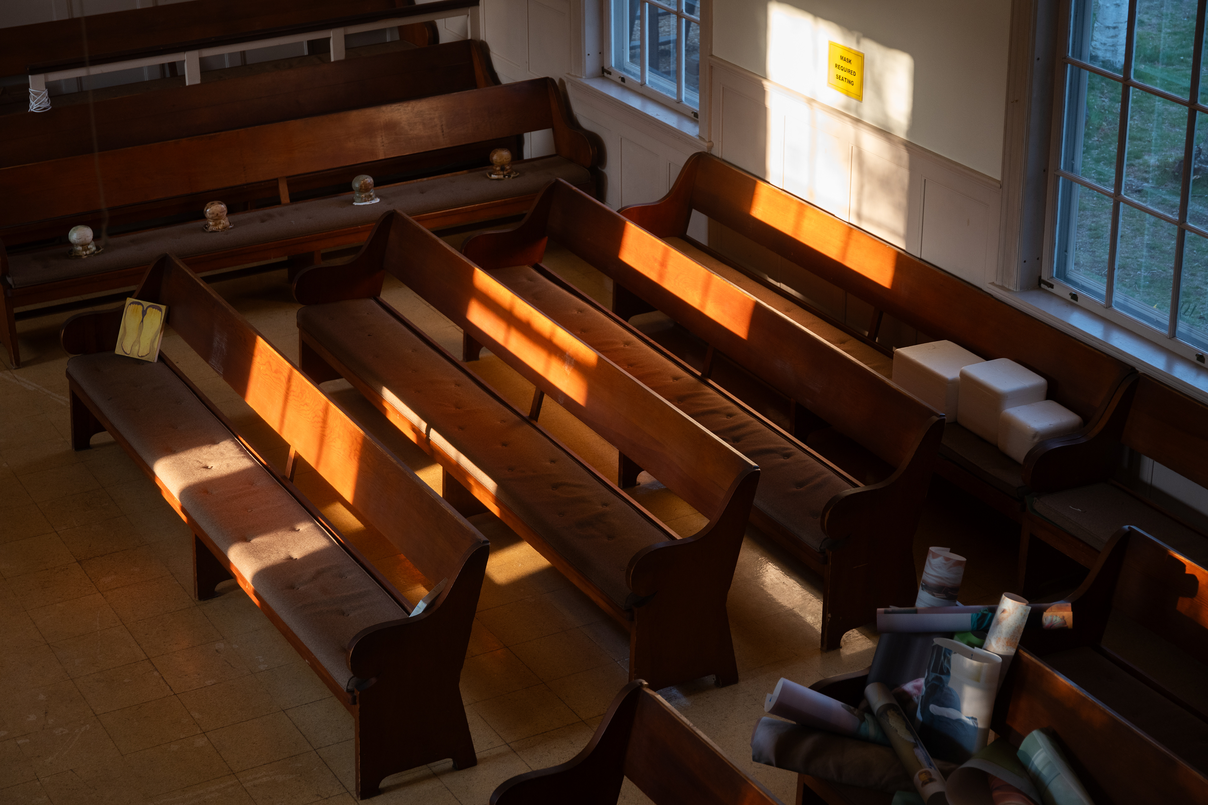 On a drizzling Saturday afternoon, Friends Meeting at Cambridge is inhabited with new beings. In between the orderly arranged pews lie a variety of objects, from glazed ceramics and painting scrolls to seemingly insignificant items like found dolls and styrofoam coolers, each of which are invited to breathe with new air and animatedness. As I entered this Quaker’s gathering place on the outskirts of Harvard Square, I was first enthralled by the expansiveness of the two-story church, with light-filled windows and views of greenery outside. I was then quickly surprised by how the curated objects inhabit a much more minor scale, with some hidden underneath or behind the benches. I was greeted by the curators / artists An Hà and Vivian Tran who offered me a program (a map with exhibited objects and where they are located) and encouraged me to explore the entirety of the meeting house. I followed my instinct to sit down and become closer to, or even a part of, this unlikely gathering, in the quiet, in the stillness, along with the gentle soundscape of the rain.